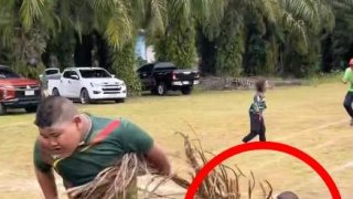 เด็กน้อยแข่ง "ลากกาบมะพร้าว" เกาะแน่นมาก แม้ตัวจะหงาย เพื่อชัยชนะ