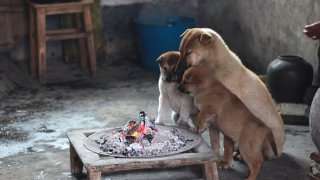 ฉลาดแสนรู้! ภาพถ่ายแม่สุนัขและลูกๆในจีนนั่งล้อมวงรอบกองไฟในวันที่หนาวเหน็บ