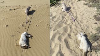 ช่วงเวลาที่แปลกประหลาด เมื่อแมวดึงลากเพื่อนจอมขี้เกียจให้ตามมันไปเดินเล่นบนชายหาด (มีคลิป)