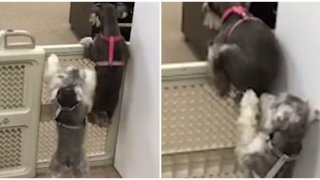 แสบจริงๆ น้องหมาช่วยกันดันหลังปีนข้ามรั้วกั้น เพื่อไปหาอาหารกิน (มีคลิป)