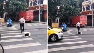 เล่นเอางงกันทั้งถนน!! ชายถือเชือกลากไมโครเวฟข้ามทางม้าลายราวกับกำลังจูงสัตว์เลี้ยงเดินเล่น (มีคลิป)