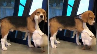 เพื่อนรักต่างสายพันธุ์!! ภาพสุดน่ารักของเจ้าสุนัขพันธุ์บีเกิ้ลกับห่านน้อยเพื่อนรัก