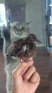 เมื่อลูกนกตกต้นไม้ แล้วทาสแมวเก็บมาเลี้ยง