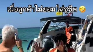เมื่อนักท่องเที่ยวไม่ยอมใส่เสื้อชูชีพก่อนขึ้นเรือ พี่ไกด์ก็ทำท่าสื่อสารให้เขาเข้าใจ ท่าน่ากลัวขนาดนี้ ยอมใส่ก็ได้ 😅