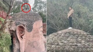 บักคนซั่ว!! หนุ่มนักท่องเที่ยว ฝ่ารั้วกั้นขึ้นไปยืนฉี่บนเศียรพระ ที่อุทยานพระใหญ่ในจีน คนแห่ประณามพฤติกรรมน่ารังเกียจยับ