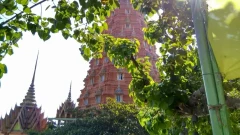 เจดีย์วัดอันสวยงามสีส้มอ่อนตา ต้นโพธิ์คือสัญลักษณ์ของวัดและความร่มรื่น