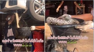 ใต้ท้องรถมีกลิ่นไหม้เลยเอาไปเข้าอู่..แทบช็อก! เจองูเหลือมใหญ่ตายคาที่