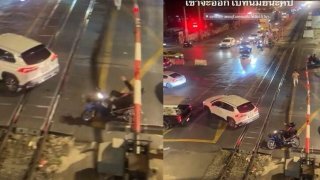 เตือนไม่ฟังเกือบขิตซ่ะแล้ว! จยย.ฝ่าด่านข้ามทางรถไฟ