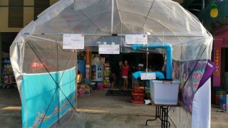 ไอเดียเด็ดต้านโควิด-19 ชาวบ้านทำอุโมงค์พ่นละอองฆ่าเชื้ออัตโนมัติ ติดตั้งหน้าร้านขายของชำ