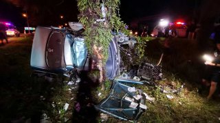 เก๋งเสียหลักชนเสาไฟส่องทาง หมุนอัดก้อบปี้ต้นไม้ร่องกลางถนน คนขับอาการสาหัส