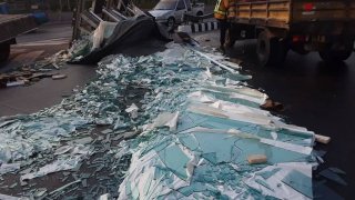 รถบรรทุก 10 ล้อ เสียหลักพลิกตะแคง กระจกที่บรรทุกมาแตกกระจาย