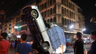 กระบะบรรทุกผัก เต็มคันหนักกว่า 3.5 ตัน เบรครถกระทันหัน ทำให้ล้อหน้ายกชี้ฟ้า