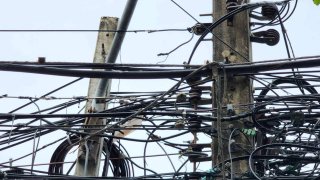 เสาไฟไทยเอียงกะเท่เล่เพราะสายสื่อสารพันกันยั้วเยี้ย สุดอเมซซิ่ง