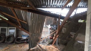 เกิดเหตุเสาไฟฟ้าล้มทับหลังคาโรงจอดรถบ้านของชาวบ้านได้รับความเสียหาย