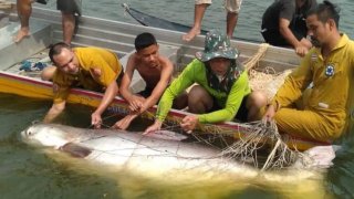 ระทึก!ช่วยปลาบึก4ตัวหนักกว่า300กิโลฯอ่างหรองปลาไหลระยอง