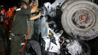 หนุ่มขับกระบะหลุดโค้งข้ามเลนชนอัดก๊อปปี้สิบล้อบรรทุกแผ่นปูน