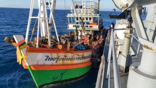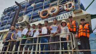 ตม.ปากน้ำ ใช้เรือตรวจการณ์ ตรวจแรงงานประมง พบคนต่างด้าวหลบหนี เสพยาเสพติดบนสะพานปลา