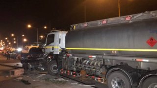 รถบรรทุกน้ำมันหลับในพุ่งชนรถจอดข้างทาง ยับ 8 คันรวด