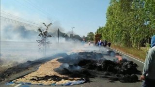 รถขนเฟืองเกี่ยวสายไฟเกิดไฟลุกไหม้ ใส่กองข้าวที่ชาวบ้านตากไว้เต็มถนน