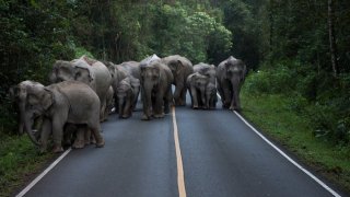 สะกดทุกสายตา! ของโขลงช้างป่าเขาใหญ่ ออกมาเดินบนถนน ที่หาชมได้ยากมาก