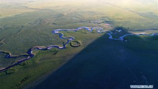 สายน้ำคดเคี้ยวแต่งแต้มทุ่งหญ้าเขียวของมองโกเลีย