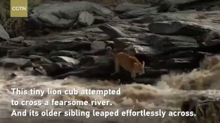 ค่อยๆ ฝึกนะ! ลูกสิงโตรวบรวมความกล้ากระโดดข้ามธารน้ำไหลเชี่ยว