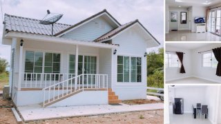 แบบบ้านสไตล์คอทเทจ ขนาด 2 ห้องนอน 1 ห้องน้ำ ตกแต่งโทนสีขาวสะอาด