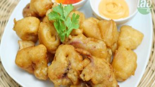 ปลาหมึกทอดกรอบ หอมๆ ทอดให้แห้ง ทานกับน้ำจิ้มมายองเนสแบบเผ็ด ปรุงรสชาติเล็กน้อย