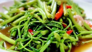 ผัดผักบุ้งใส่หมูกรอบ ทำง่าย เผื่อหิวข้าวต้มยามดึก | ครัวบ้านทราย