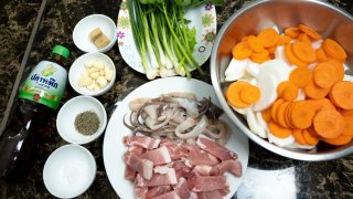 สูตรวิธีทําต้มจืดหัวไช้เท้า ใส่แคร์รอตใส่หมูสามชั้น และปลาหมึกสด ไม่คาว