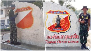 ฝีมือผมเอง เป็นทหารของชาติด้วยความภูมิใจ ทำป้ายหน่วยกองพันฯ บนแผ่นหินขนาดใหญ่
