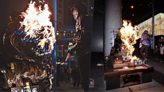 เผาสิงโตคู่แห่งฮ่องกง โดนม็อบในฮ่องกง หน้าแบงก์ HSBC ที่ฮ่องกง