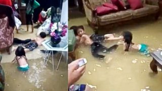 ครอบครัวเจอฝนถล่มน้ำท่วมบ้านไม่หวั่น เด็กๆเปลี่ยนให้เป็นสระว่ายน้ำซะเลย