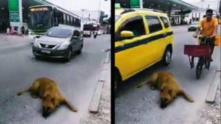 ชาวเน็ตดูคลิปด้วยใจระทึก "หมาไม่สนโลก" นอนบนถนน รถเกือบชนตายหลายคัน