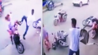 หนุ่มหัวร้อนกระโดดถีบ!! สาวที่ขับมอเตอร์ไซด์ที่มีเด็กนั้งมาด้วยจนกระเด็นล้ม ทั้งจับเก้าอี้จะฟาดซ้ำ