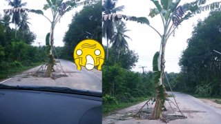 ชาวบ้านเดือดร้อน!! ถนนเป็นหลุมขนาดใหญ่ จนต้องเอาต้นกล้วยมาวางไว้ กลายเป็นถนนขวางทางกล้วย!!