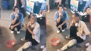 น่ารักสาวใจบุญ!! นักเรียนสาว เข้าไปช่วยลุงพิการร้องเพลงหาเงิน ในตลาด