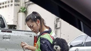 ภาพประทับใจ!!ชาวเน็ตแชร์!! ภาพพนักงานทำความสะอาดถนนท่านหนึ่งสะพายน้องหมาไปทำงานด้วย