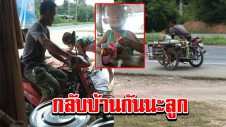 พ่อสุดช้ำ พาลูกขี่รถพ่วงข้าง เดินทางกลับบ้านเกิด หลังถูกเมียทิ้ง