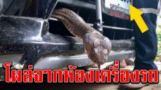 เจ้าบ้านตกใจ เจอจงอางขนาดใหญ่แอบเลื้อยเข้าในห้องเครื่องรถเก๋ง