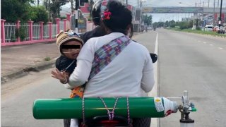 ภาพสลดใจของคนไทย พ่อขี่ จยย.แม่อุ้มเด็กน้อย มัดถังออกซิเจนขนาดใหญ่ พาลูกที่ป่วยไป รพ.