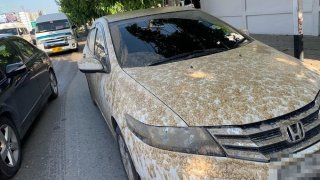 เละทั้งคัน! น้ำปูนจากการก่อสร้างรถไฟฟ้าสายสีชมพู หล่นสาดใส่รถยนต์ชาวบ้านที่จอดข้างทาง