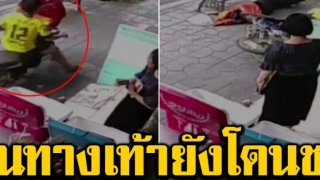 ชนกันอีก!! ฟุตบาทขับสบาย!!คลิปนาที จยย.วิ่งบนทางเท้า พุ่งโดนหนุ่มซื้อราดหน้า ลงไปหองคาที่