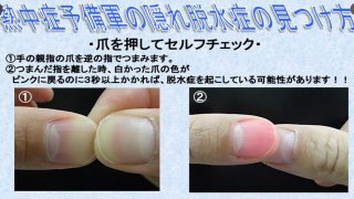 กดเล็บหัวแม่โป้งจนขาว แล้วปล่อย กลับมาสีชมพูเหมือนเดิมภายใน 3 วินาที หากเกิน แสดงว่าร่างกายกำลังขาดน้ำ