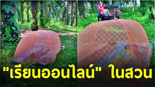 ไอเดียเลิศ!! เรียนที่ไหนก็ได้ แม่หวั่นทิ้งลูกตามลำพัง พากางมุ้งเรียนออนไลน์ในสวนปาล์ม
