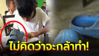 ครูเห็นนักเรียนชาย ทำตัวแปลกๆ หยิบรองเท้าขึ้นมาบนโต๊ะ เลยจะเข้าไปต่อว่า