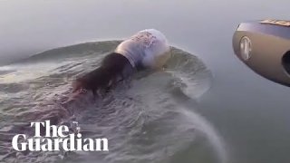 นักตกปลาช่วยถอดขวดพลาสติกออกจากหัวหมี