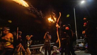 ผู้ประท้วงในฮ่องกงจุดไฟเผาคนต่อต้าน
