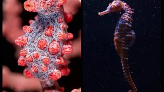ม้าน้ำแคระแปลกประหลาดสีสันแปลกตาบนปะการังชนิดหนึ่ง ที่เรียกว่ากัลปังหากอร์โกเนียน