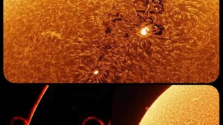 ภาพถ่ายระยะใกล้ ที่น่าทึ่งของดวงอาทิตย์ เปลวสุริยะและบริเวณมืดๆสีดำที่เห็นตรงนั้น เรียกว่าจุดดับดวงอาทิตย์